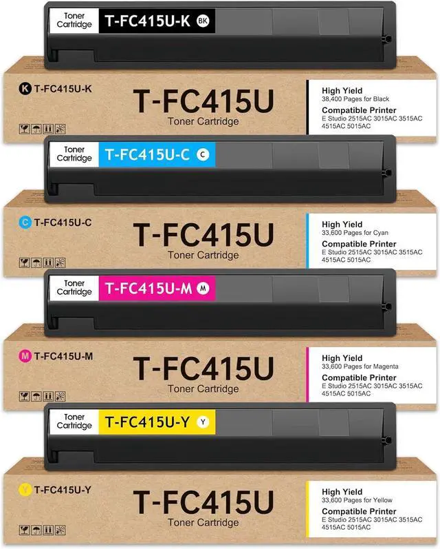 Package Contents: T-FC415U toner cartridge set 4-color replacement for Toshiba T-FC415U-K T-FC415U-C T-FC415U-M T-FC415U-Y toner, 4 colors in one pack, including 1*T-FC415U-K black, 1*T-FC415U-C cyan, T-FC415U-M magenta, 1*T-FC415U-Y yellow toner cartridge