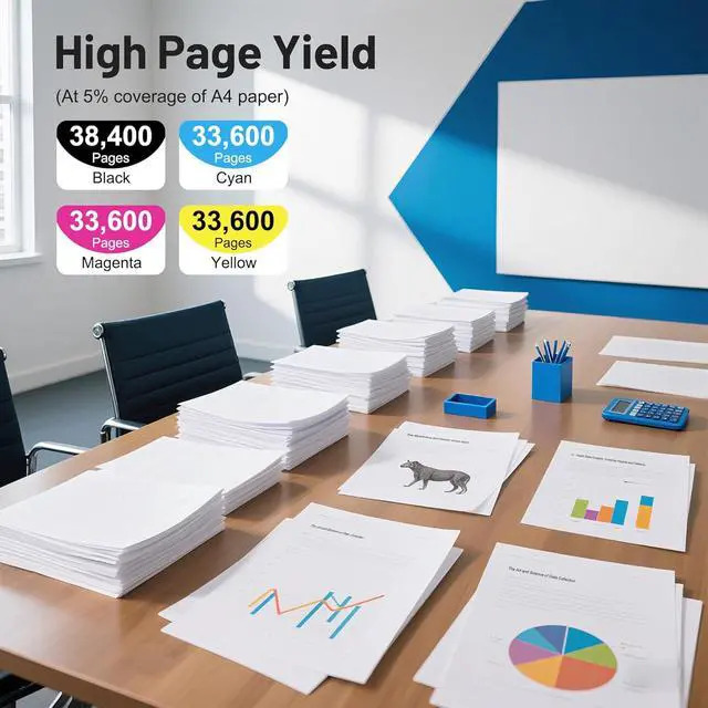 Page Yield: T-FC415U high yield toner for Toshiba printer prints up to 38,400 pages per black toner cartridge, 33,600 pages per color toner cartridge (at 5% coverage of A4 paper)