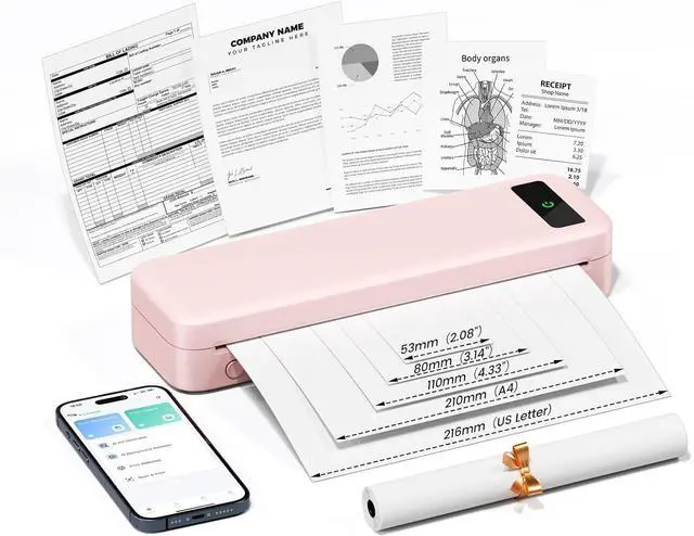 Thermal Printer [Multi-Size Printing]: The wireless portable printer with built-in paper bin, support thermal roll paper, continuous and single sheet thermal paper. This small wireless printer also supports 5 sizes of thermal paper: 8.5 X 11 US Letter, A4, 4.33'' (110mm), 3.14'' (80mm), 2.08'' (53mm) width thermal paper, can meet most of your needs