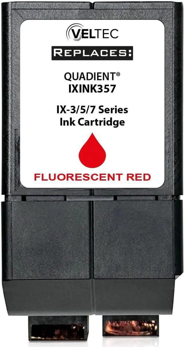Manufactured in the USA USPS Approved Fluorescent Red Ink Cartridge For use in Quadient IX3 / IX5 / IX7 Postage Meters. Replaces IXINK357 ink cartridge USPS Compliant fluorescent red ink Yield: Up to 17,000 prints
