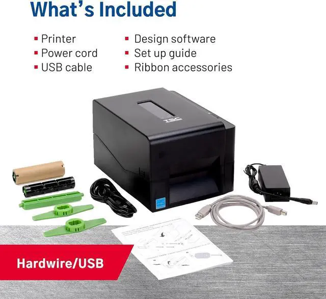Whats Included: This thermal sticker and label printer comes with a power cord, USB cable, labeling software, setup installation guide, and ribbon accessories. The tag and shipping label maker machine measures 11.02 x 8.03 x 11.02 inches.