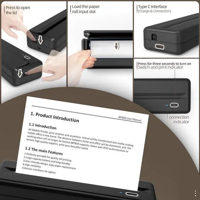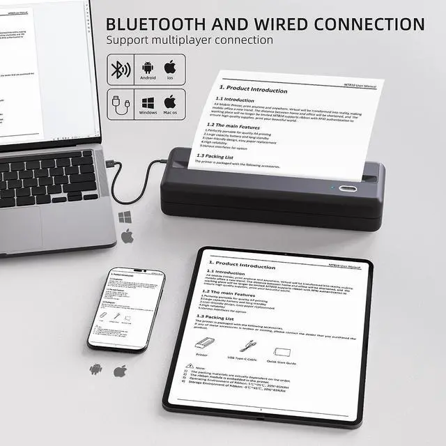 Seamless Wireless ConnectivityEnjoy effortless wireless printing with this wireless printer. Easily connect via Bluetooth to your iOS or Android devices, or use the USB-C port for laptops or PCs printing. Whether in a bustling coffee shop or a quiet meeting room, this no ink printer offers the flexibility you need for any environment. Note: Smart mobile devices need to download the "HerePrint" APP, and PC users need to install the driver through the official website.