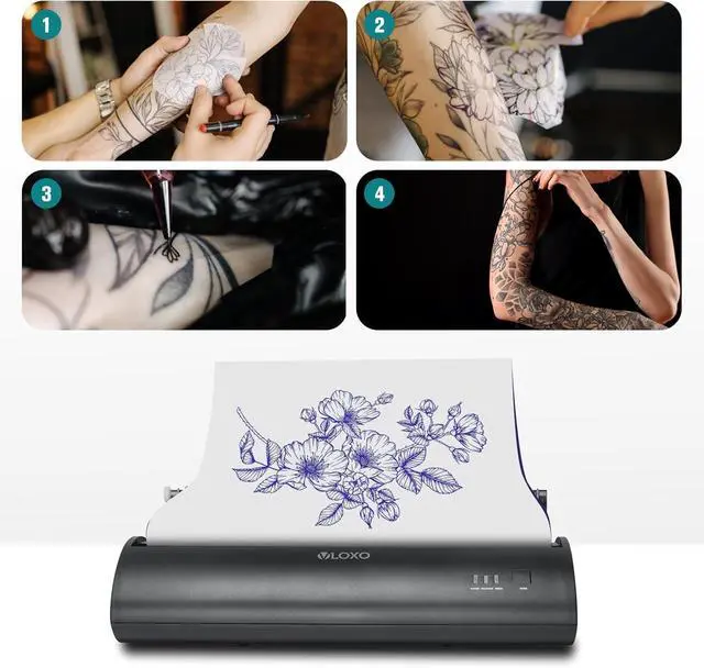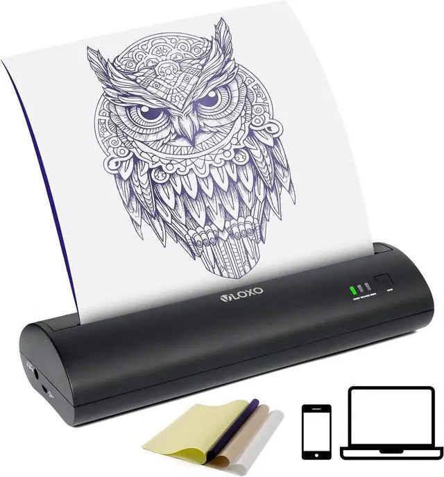 Portable and Rechargeable: VLOXO thermal transfer tattoo printer is cordless, and used without power cord limits. It works for 3-4 hours once fully charged, it can be used indoors and outdoors. It weighs only 0.77kg, is very light, and is convenient to store and carry outside