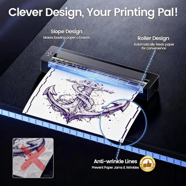 The TATTMUSE 2025 New Launch Tattoo Stencil Printer is a revolutionary thermal tattoo printer designed for tattoo beginners and artists alike. This mini tattoo stencil printer features an ultra-compact design, making it smaller than most A4 printers and as light as a bottle of water. It is battery-powered and wireless, ensuring portability and convenience. Compatible with phones, tablets, and PCs, this impresora para tatuajes offers seamless connectivity via Bluetooth and USB Type-C, supporting Android, iOS, Windows 7+, and macOS 10+. Equipped with a high-definition 300dpi print head, this tattoo thermal printer delivers precise and clear prints, even for intricate designs with thin lines and complex patterns. The upgraded technology ensures no smudging or blending, providing high-quality results every time. Additionally, the printer features a wrinkle-free smart mode with patented technology, which adds specialized lines to the edges of the paper to keep it flat during printing. This minimizes paper misalignment or damage, saving transfer paper and making the tattoo process more efficient and cost-effective. The TATTMUSE tattoo printer also comes with a smart app that offers over 800 free tattoo designs and intuitive editing tools. Users can easily split larger designs into multiple parts for printing and convert photos into outlines using the filter function. The apps tattoo preview feature allows users to see the final result in advance, while the latest AI-powered design feature enables the creation of unique, custom stencils in seconds. Note that some advanced features and additional design resources require a paid subscription. Whether youre in a tattoo studio, at an outdoor event, or tattooing at home, the TATTMUSE termocopiadora tattoo is the perfect tool for creating high-quality stencils on the go. With its portable design, high-resolution printing, and user-friendly features, this impresora de tatuajes is a game-changer for both beginners and experienced artists.