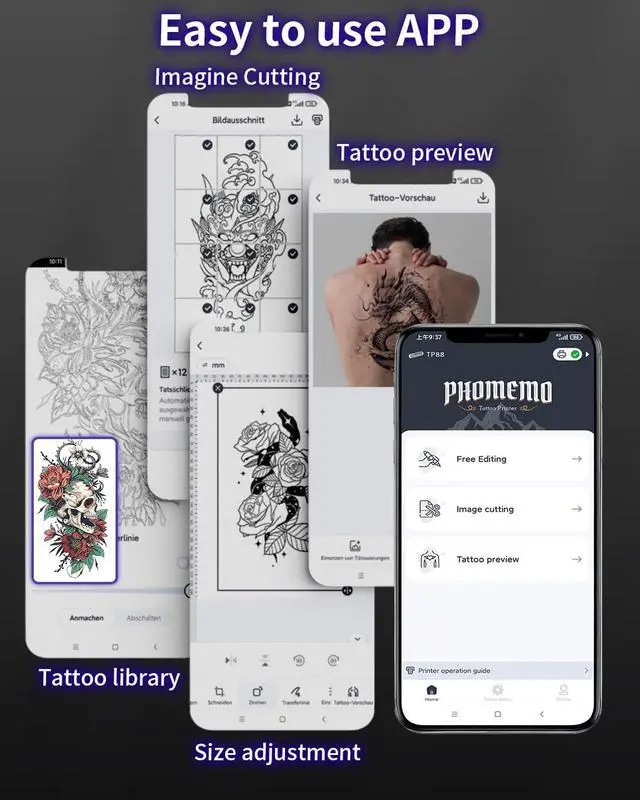 Powerful APP - Phomemo APP not only supports printing mobile phone pictures, but also supports multiple splicing, cropping, massive material templates. It can convert your pictures into transfer lines for your drawing use. Tattoo patterns can also be previewed, just upload your photo. Simple and easy to use!