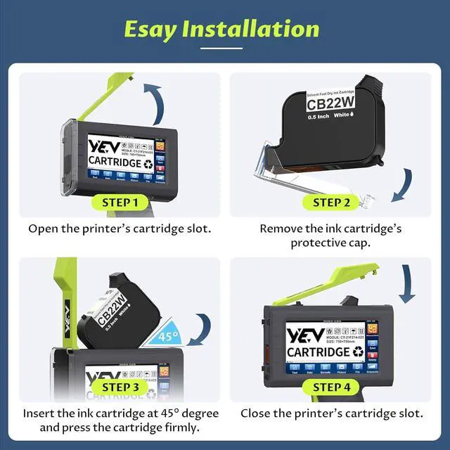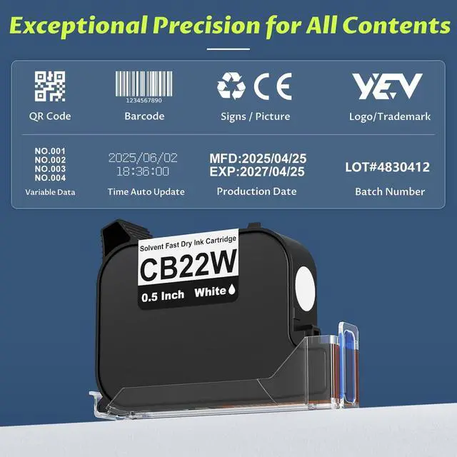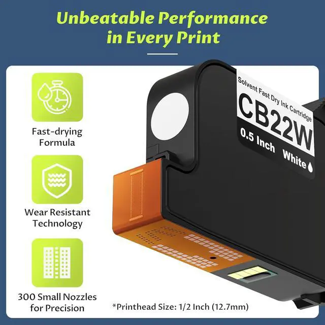 Genuine Ink for Yev Printers: Designed specifically for Yev handheld inkjet printers, the CB22W is an authentic solvent based fast drying cartridge that incorporates a 0.5-inch (12.7mm) printhead.