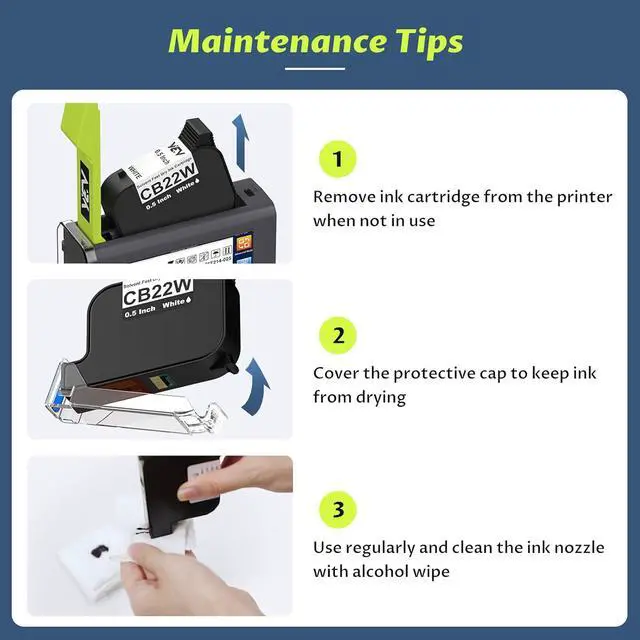 Tips for Extending Cartridge Life: To ensure peak performance, it's advisable to remove the cartridge from the handheld printer when not in use and to cover the nozzle with the protective cap. If you experience any clogging, use an alcohol wipe to clean the nozzle for seamless operation.