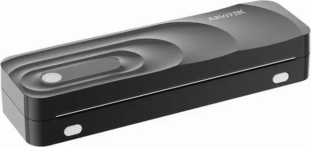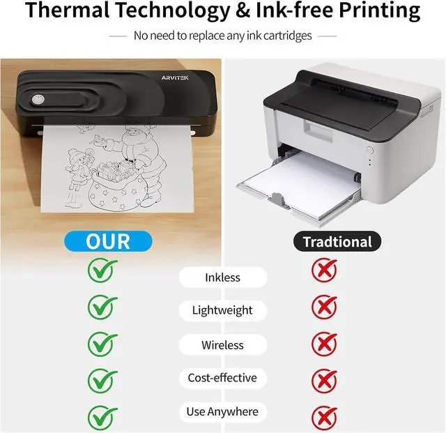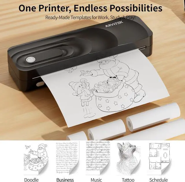 Inkless Printer Arvitek portable printer uses advanced thermal technology, requiring no ink, toner, or ribbons. The package includes the thermal printer, 3 thermal paper rolls (1 pre-installed + 2 extras), 2 fold thermal paper, a carrying case, charging cable, manual, and guide card.