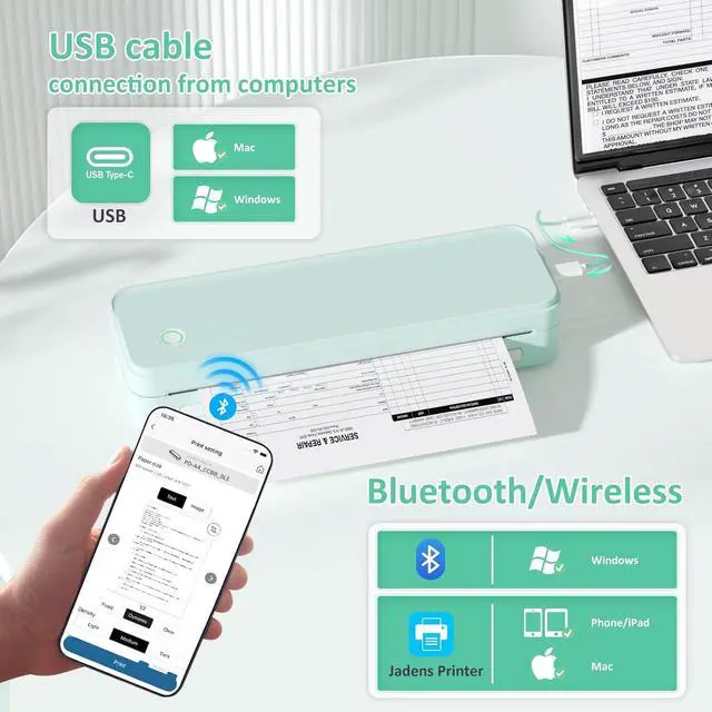 Seamless Bluetooth Connectivity - The Gloryang mobile sticker printer effortlessly connects to iOS & Android devices via Bluetooth. It also serves as a compact printer for laptops and computers. Simply download the app ''Jadens printer'' for smartphone printing and install the driver for laptops. Connects via USB cable when you use a computer to print. Print anytime, anywhere.