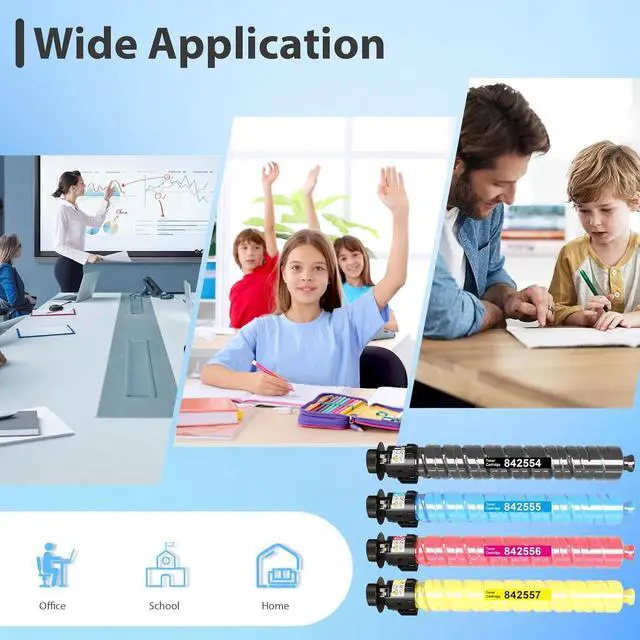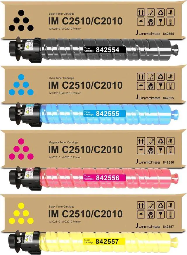 Package Contents: 4-Pack IM C2510 IM C2010 imc2010/2510 Toner Cartridge -842554 Black Toner Cartridge, 842555 Cyan Toner Cartridge, 842556 Magenta Toner Cartridge, 842557 Yellow Toner Cartridge