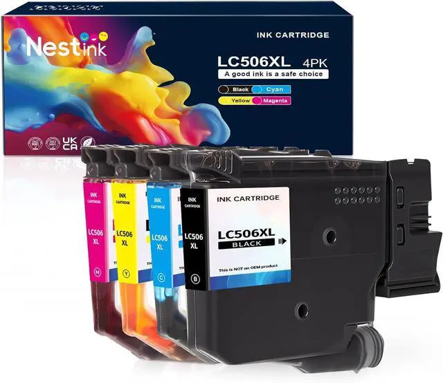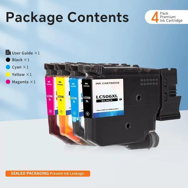 The box contains:1 New Extra Capacity Cartridge LC506XL pack of 4 ink cartridges:LC506XL Cyan,Magenta,Yellow and Black ink cartridges,a user guide.