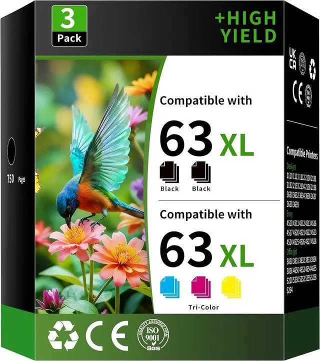 Package Contents: 3 Pack High Yield 63XL Ink Cartridge Compatible Replacement forHP63XL HP63 63 XL ( 2 Black +1 Tri-Color )