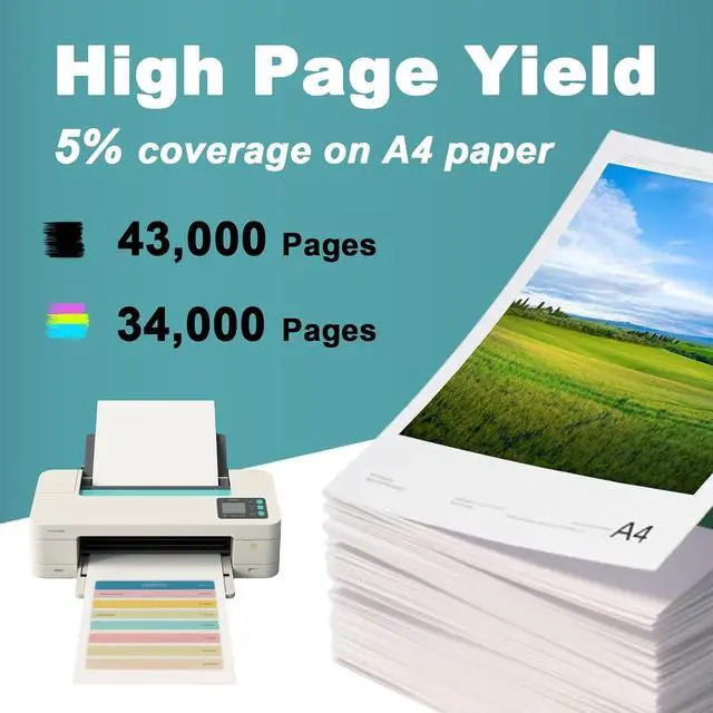 High Yield: 43,000 Pages per black Toner Cartridge and 34,000 Pages per color Toner Cartridge (5% coverage on A4 paper)