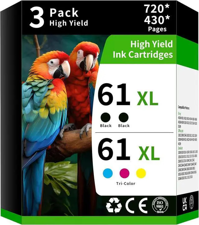 Package Contents: 3 Pack 61XL ink Cartridge Replacement for HP 61XL(2 Black+1 Tri-Color)