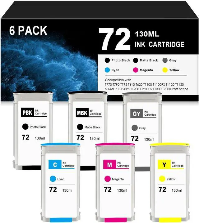 Package Contents 6-pack 72 ink set: Matte Black (C9403A), Photo Black (C9370A), Cyan (C9371A), Magenta (C9372A), Yellow (C9373A), Gray (C9374A).