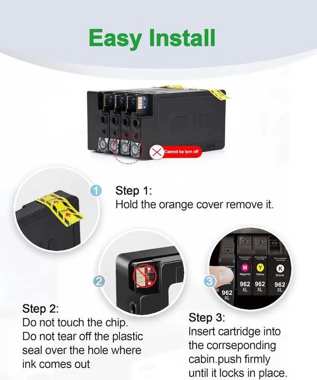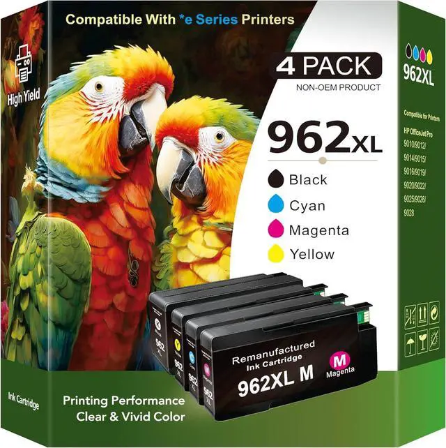 What's Included: A total package providing 1 Black ink 962XL 962 XL cartridge, 1 Yellow ink 962XL 962 XL cartridge, 1 Cyan ink 962XL 962 XL cartridge, 1 Magenta ink 962XL 962 XL cartridge, along with a handy user guide