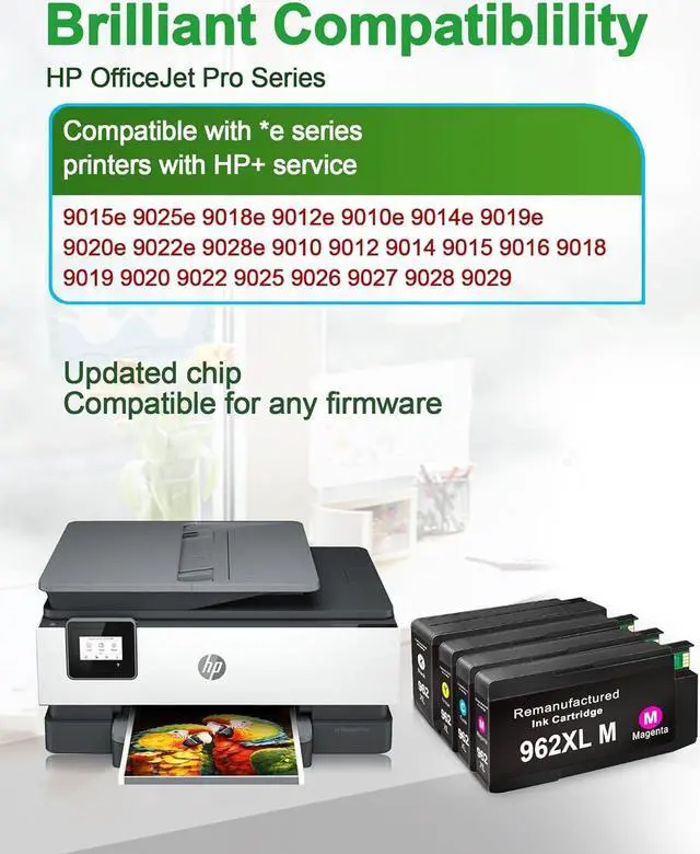 Note: The RBBRVV 962XL ink cartridges for HP printers come in a 4-pack combo, including black, cyan, magenta, and yellow 962 ink. These cartridges are compatible with *e-series printers that are activated with HP+ service and Instant Ink. Enjoy the freedom of unlimited printing without the restrictions of traditional subscription models!