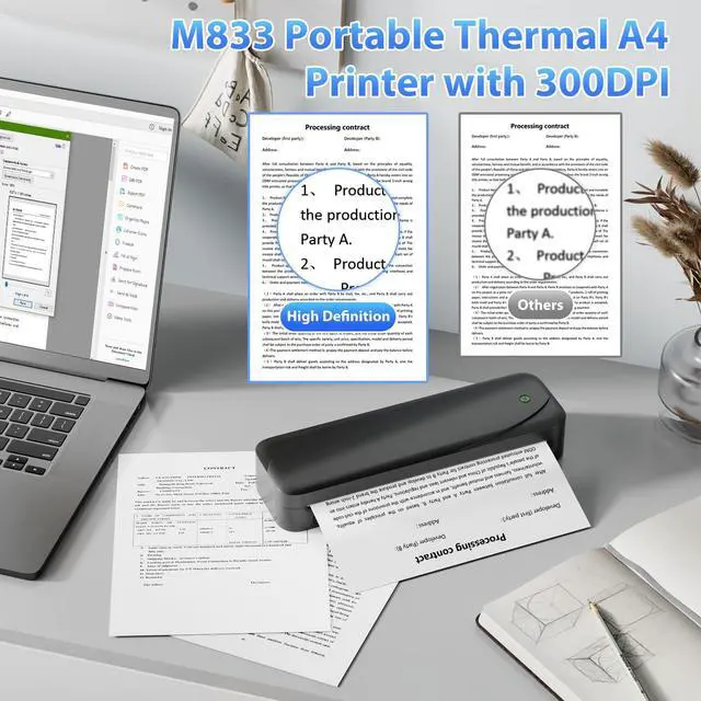 M833 wireless thermal printer delivers sharp, smudge-free prints with advanced thermal tech. High resolution with 300dpi. Fully charged enough for a week of tasks or a weekend trip. Compatible with roll paper, fan-fold paper, and tattoo transfer paper, it handles PDFs, Word files, images, and web content from your phone. Toss it in your bag and print anytime, anywhere.