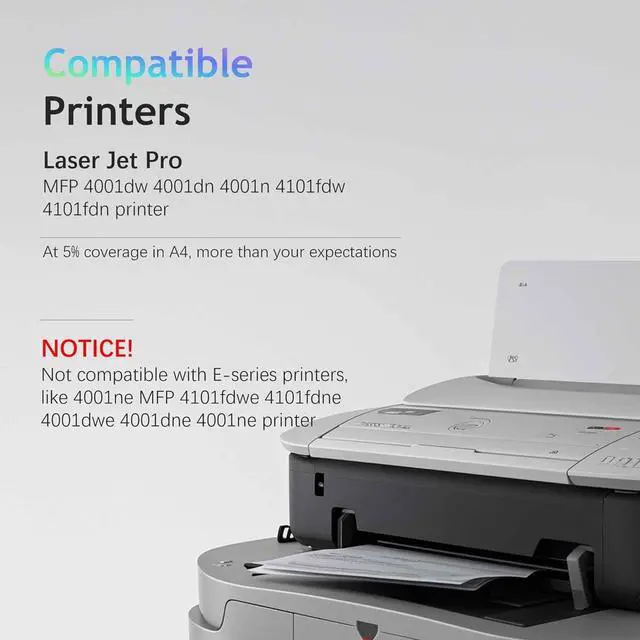 NOTICE: Not compatible with E-series printers, like 4001ne MFP 4101fdwe 4101fdne 4001dwe 4001dne 4001ne printer/ Message of Cartridge Low might be popped up every time you start printing, please ignore it since we are applying transferred chip/ Cartridge might not be able to show the print pages