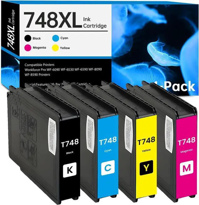 Product Name: 748 XL 748XL Ink Cartridge 4-pack replacement for T748XL Workforce ink cartridge, 1 X T748XL120 black ink cartridge, 1 X T748XL220 cyan ink cartridge, 1 X T748320 magenta ink cartridge, 1 X T748XL420 yellow ink cartridge