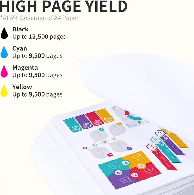 High Page Yield: 12,500 pages black toner cartridge and 9,500 Pages color toner cartridge at 5% coverage (Letter/A4)
