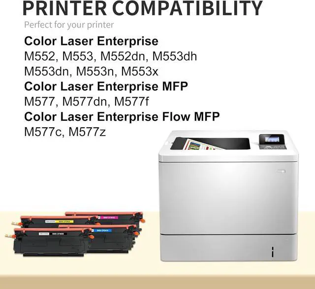 • Compatible Printers HP Color Laser Enterprise M552, M553,Color Laser Enterprise MFP M577, Color Laser Enterprise Flow MFP M577c, M577z; Color Laser Enterprise M552dn, M553dh, M553dn, M553n, M553x,Color Laser Enterprise MFP M577dn, M577f