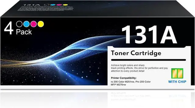 Package Included: 4 Pack 131A Toner Cartridges. 1 Black(CF210A), 1 Cyan(CF211A), 1 Magenta(CF213A), 1 Yellow(CF212A)