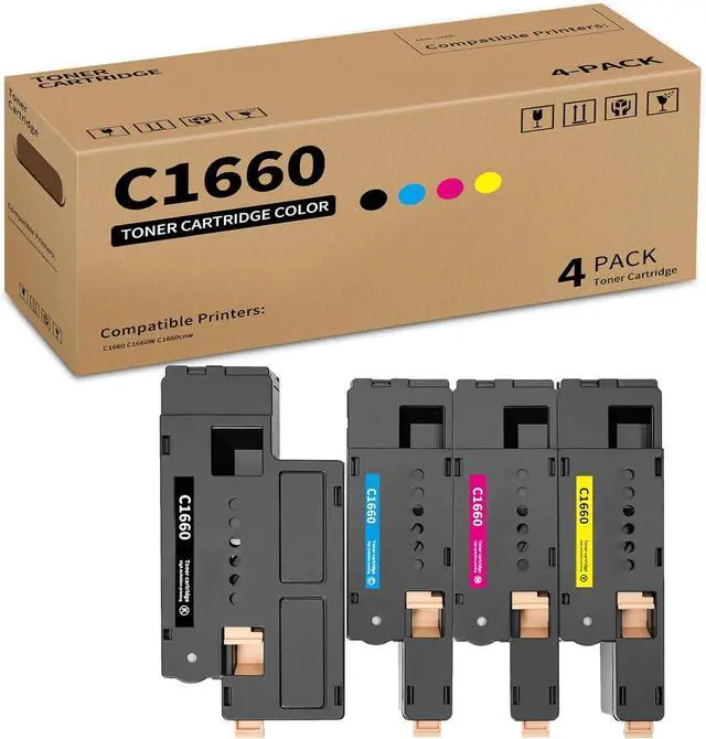 Package Contents: 4 Pack C1660 Toner Cartridge Replacement for DELL 4G9HP DWGCP V3W4C V53F6 (1 Black+1 Cyan+1 Yellow+1 Magenta)