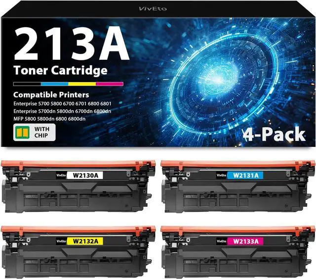 Contents: VivEto replacement for 213A toner cartridge; 1 X 213A black toner cartridge(W2130A), 1 X 213A cyan toner cartridge(W2131A),1 X 213A yellow toner cartridge(W2132A),1 X 213A magenta toner cartridge(W2133A)