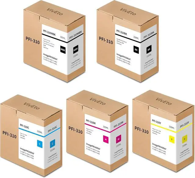 • Contents: VivEto PFI310 ink replacement for Canon PFI-310 pigment ink cartridge 5 Pack 1 X PFI-310 Matte Black (2358C001AA) 1 X PFI-310 Black (2359C001AA) 1 X PFI-310 Cyan (2360C001AA) 1 X PFI-310 Magenta (2361C001AA) 1 X PFI-310 Yellow (2362C001AA)
