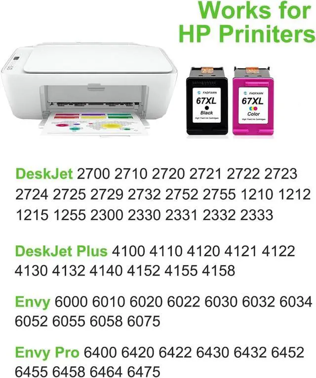 Compatibility - Plug & Play: With intelligent chips for seamless recognition.Compatible with DeskJet 2700 2710 2720 2721 2722 2723 2724 2725 2729 2732 2752 2755 1210 1212 1215 1255 2300 2330 2331 2332 2333;DeskJet Plus 4100 4110 4120 4121 4122 4130 4132 4140 4152 4155 4158;Envy 6000 6010 6020 6022 6030 6032 6034 6052 6055 6058 6075;Envy Pro 6400 6420 6422 6430 6432 6452 6455 6458 6464 6475 Printer