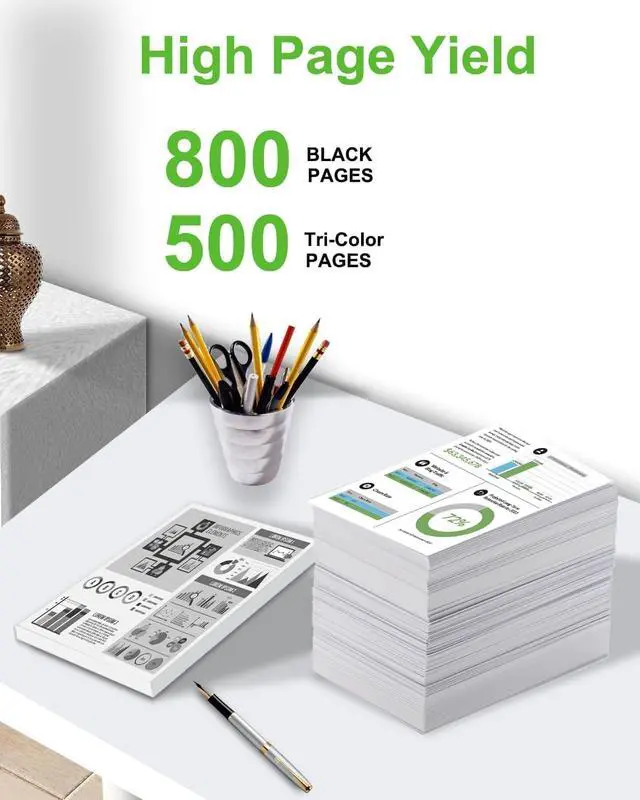Low Cost & Up to 1,300 Pages: Maximize value.The black cartridge delivers up to 800 pages, and tri-color up to 500 pages (at 5% coverage).They provide massive savings and fewer replacements, ideal for homes and offices