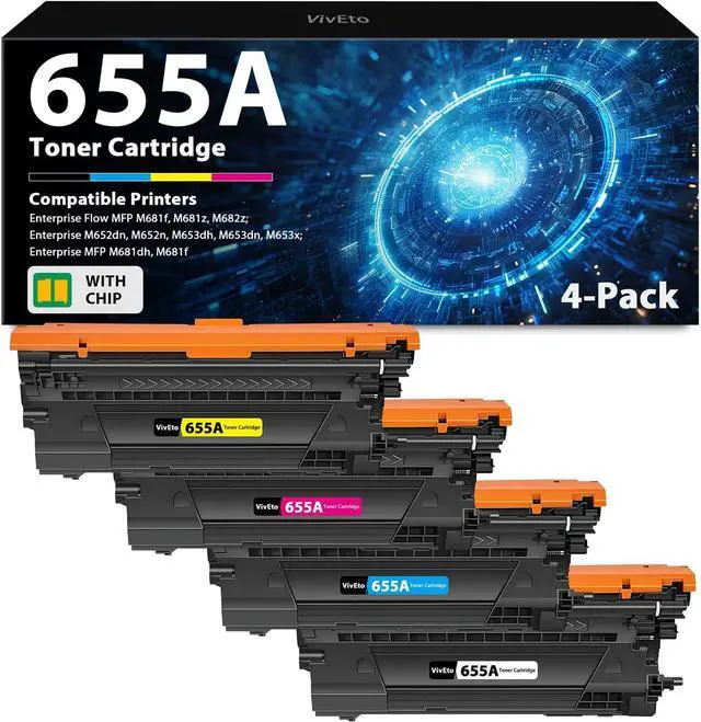 • Contents: VivEto toner replacement for HP 655A toner cartridge; 1 X 655A Black toner(CF450A), 1 X 655A Cyan toner(CF451A), 1 X 655A Yellow toner(CF452A), 1 X 655A Magenta toner(CF453A)
