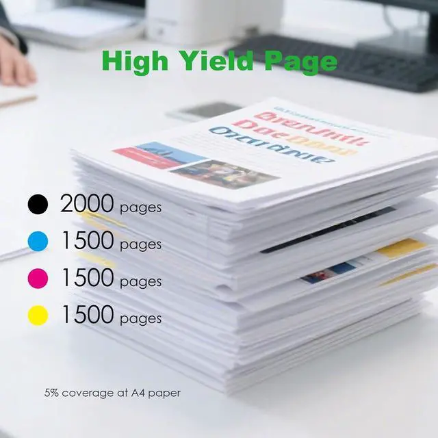 Page Yield: Black 2000 pages, Cyan Magent Yellow 1500 pages (Letter/A4, at 5% coverage)