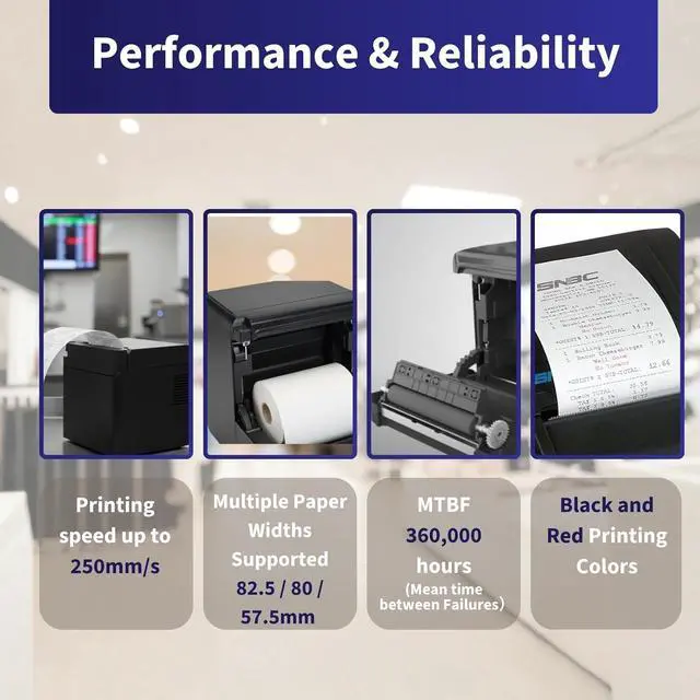 [High-speed printing and simple paper change]: Print receipts at a fast 250mm per second to keep your customer lines moving quickly; the drop-in design allows your staff to reload paper in seconds by just open the lid, drop in the roll, and close it; the direct thermal technology will save you time and money from replacing messy ink or ribbons during a busy shift