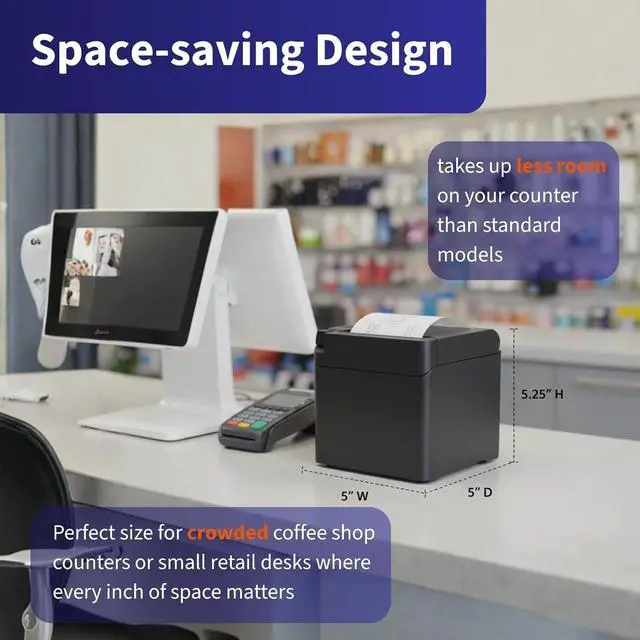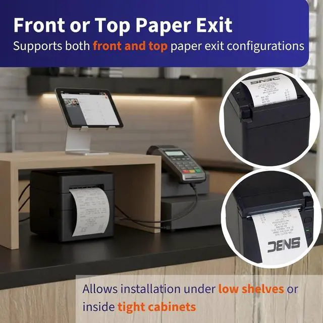 [Cube shape with Top and Front-exit printing]: This Bluetooth receipt printer takes up 40% less room on your counter than standard models; the paper can slide out from the front instead of the top; making it possible to hide the printer under low shelves or inside tight cabinets to keep workspace clear; desirable size for crowded coffee shop counters or small retail desks where every inch of space matters