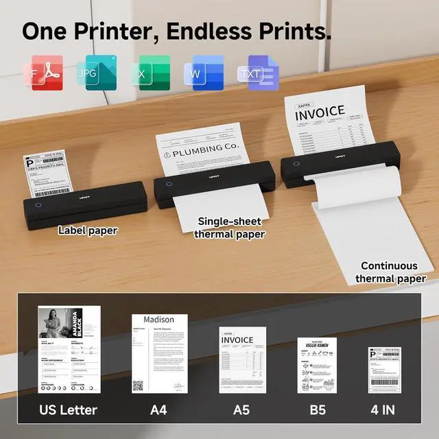 Pro-Level Multi-Size Compatibility Meet all your printing needs with unmatched versatility. This portable thermal printer supports widths from 90-216mm, seamlessly handling US Letter (8.5x11), A4Width:210mm, A5Width:148mm, and 4-inchWidth:102mm rolls. It's your all-in-one thermal label printer and document printer, working with single sheets, continuous paper, and shipping labels. (Tip: Use thermal paper only, print side up).