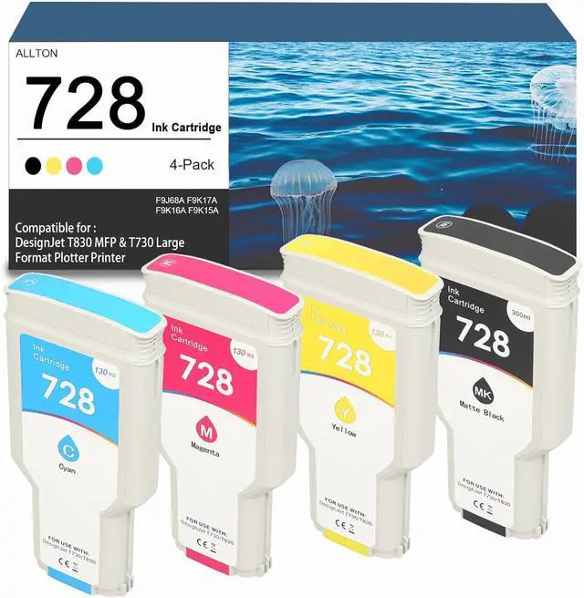 Package Contents:4 pack 728 ink cartridges,1 Black 728 ink cartridge(F9J68A),1 Cyan 728 ink cartridge(F9J67A),1 Magenta 728 ink cartridge(F9J66A),1 Yellow (F9J65A) 728 ink cartridge