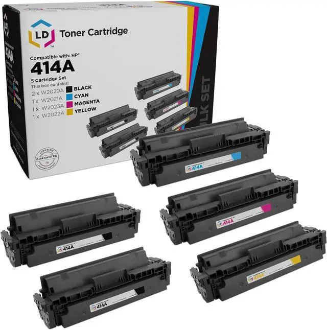 Save and print even more when you shop with LD Products! This offer includes 2 W2020A / HP 414A black, 1 W2021A / HP 414A cyan, 1 W2023A / HP 414A magenta and 1 W2022A / HP 414A yellow laser toner cartridges. Why pay twice as much for expensive brand name HP toner when our compatible replacement printer supplies are backed by a 100% Satisfaction and LIFETIME Guarantee? Compatible with HP Color LaserJet M454dn, HP Color LaserJet Pro M454dw, HP Color LaserJet Pro MFP M479dw, HP Color LaserJet Pro MFP M479fdn and HP Color LaserJet Pro MFP M479fdw. Please note, retail packaging may vary, and these cartridges will only work with printers purchased within the United States and Canada. The use of compatible replacement cartridges and supplies does not void your printer warranty. Professionally manufactured by LD Products. HP is a registered trademark of HP Inc. and is not affiliated with and does not endorse LD Products.
