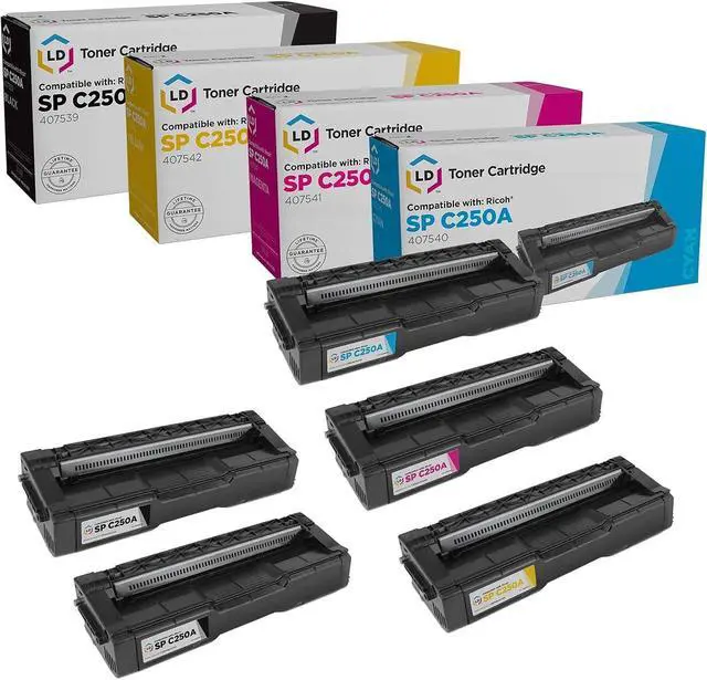 This ItemLD Products Compatible Toner Cartridge Replacement for Ricoh SP C250 (2 Black, 1 Cyan, 1 Magenta, 1 Yellow, 5-Pack) for use in C250DN, C250SF, C261SFNw & C261DNwRecommendationsLimeink Compatible Toner Cartridges Replacement for Ricoh SP C250 C260 C261 High Capacity for RICOH Aficio SP C250DN C250SF C261SFN C261SFNw C261DNw Laser Printers 1 Black 1 Cyan 1 Magenta 1 Yellow Limeink Compatible Toner Cartridge Replacement for Ricoh SP C250 C260 C261 High Capacity for RICOH Aficio SP C250DN C250SF C261SFN C261SFNw C261DNw Laser Printers (1 Black) 4 Colors Compatible Toner Cartridges SP C250 C261 High Capacity 2300 Pages for Black Cyan Magenta Yellow for RICOH Aficio SP C250DN C250SF C261SFN C261SFNw C261DNw C260 C260DNW C260SFNW Laser Printers FenGrid IMC4500 Toner Cartridge, IMC5500, IMC6000, Black, Magenta, Cyan, Yellow, 4-Color Set, Works with Printer Models Ricoh IMC4500, C5500, C6000 ASEKER SP C250 C260 C261 Toner Cartridge 4 Color Compatiblefor Ricoh SP C250DN C250SF C261SFNW C261DNW C260 C260DNW C260SFNW Printer High Capacity 2300 Pages 407539 407540 407541 407542 (BK/C/Y/M)