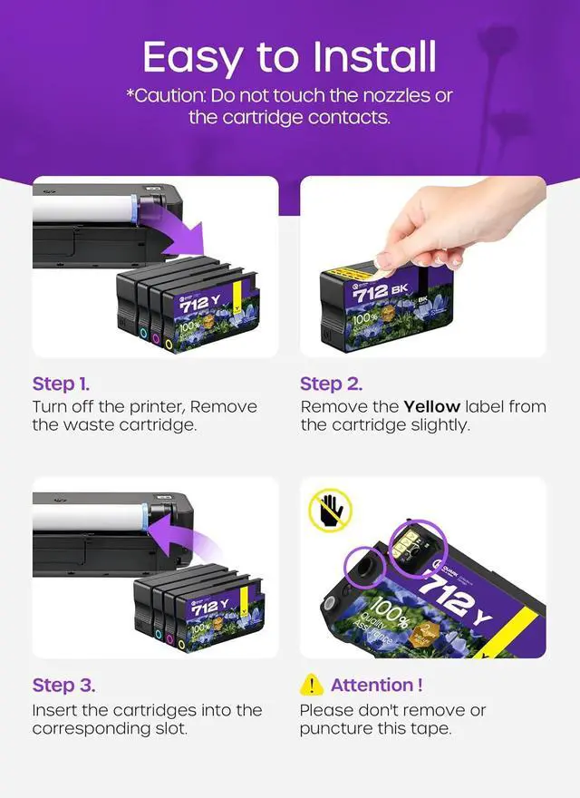 Package Content1× Black 712 Ink Cartridge, 1×Cyan 712 Ink Cartridge, 1× Magenta 712 Ink Cartridge, 1× Yellow 712 Ink Cartridge.