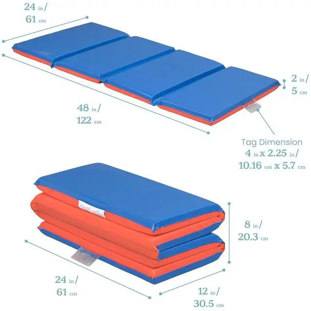 Product Dimensions: Each preschool nap mat measures 48" L x 24" W x 2" H flat or 24" L x 12" W x 8" H when folded in four; Adult Active Engaged & Direct Supervision Required
