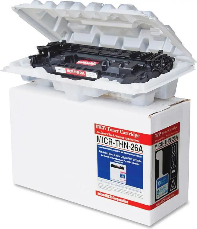 Newly manufactured toner cartridge is designed for use with Hewlett-Packard LaserJet Pro M402, MFP 426 and matching troy series machines. Cartridge contains magnetic image character-recognition ink for security purposes in printing checks. Cartridge yields approximately 3,100 pages.