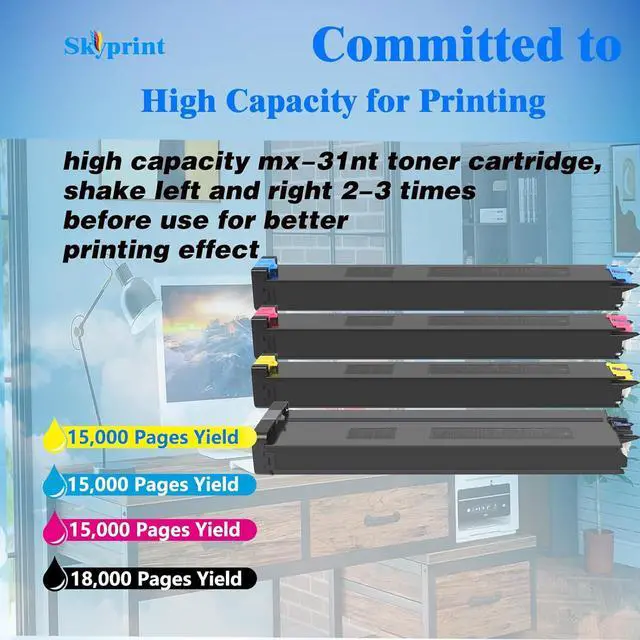 SkyPrint MX-31NT toner cartridges come with intelligent chips that automatically recognize and provide printing, Not damaging the machine Shake the toner cartridge horizontally 2-3 times before use to evenly distribute the toner