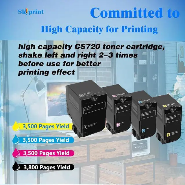 SkyPrint CS720 CS725 toner cartridges come with intelligent chips that automatically recognize and provide printing, Not damaging the machine,Shake the toner cartridge horizontally 2-3 times before use to evenly distribute the toner,providing you with better clear and natural printing effects