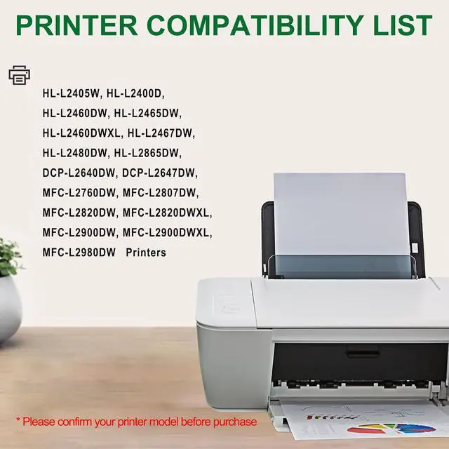 Compatible Printers: Compatible for Brother HL-L2405W, HL-L2400D, HL-L2460DW, HL-L2465DW, HL-L2460DWXL, HL-L2467DW, HL-L2480DW, HL-L2865DW, DCP-L2640DW, DCP-L2647DW, MFC-L2760DW, MFC-L2807DW, MFC-L2820DW, MFC-L2820DWXL, MFC-L2900DW, MFC-L2900DWXL, MFC-L2980DW printers.