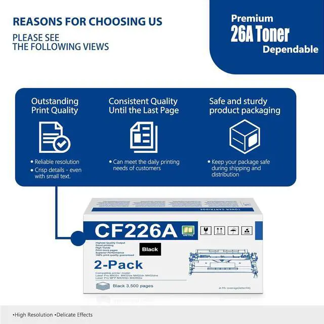This Item26A CF226A Black Toner Cartridges (2-Pack) | Replacement for HP 26a Toner Cartridge 26x Works with Pro M402 Series, Pro MFP M426 Series Printer | CF226ADRecommendations26A Black Toner Cartridge (4-Pack) | Replacement for HP 26A Toner Works with Laser Pro M402d M402n M402dn M402dw M402m M402dne; Pro MFP M426dw M426fdn M426fdw M426dw M426m M427dw Printer | CF226A 134A Black Toner Cartridge 2 Pack | Replacement for HP 134A Toner 134X W1340X Toner Cartridge Works with Laser M209dw Laser MFP M234dw Laser MFP M234sdw Printer | W1340A greencycle 26A M426fdw Compatible Toner Cartridge Replacement for HP 26A CF226A 26X CF226X for HP Laserjet Pro M402n M402dn M402dw M402dne MFP M426fdw M426dw M426fdn Printer (Black, 4-Pack) 26A Toner Cartridge for HP Printer CF226A M426fdw Compatible for HP 26A Black Laserjet Toner Cartridge 26X CF226X M402n MFP M426fdw M402dn M402 M402dw M402dne M426fdn M426 M426dw Printer Ink 2 Pack 26A CF226A Black Toner Cartridge with Chip 2-Pack Replacement for HP 26A Toner Cartridge Works with Laser Pro M402d M402n M402dw M402dne MFP M426m M426dw M426fdw M427dw Printer