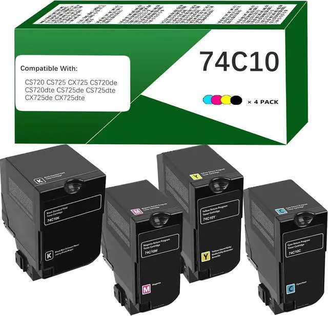Package Contents: 4 Pack Compatible for Lexmark CS720 CS725 CX725 Toner Cartridges (1x Black 74C10K0, 1x Cyan 74C10C0, 1x Magenta 74C10M0, 1x Yellow 74C10Y0).