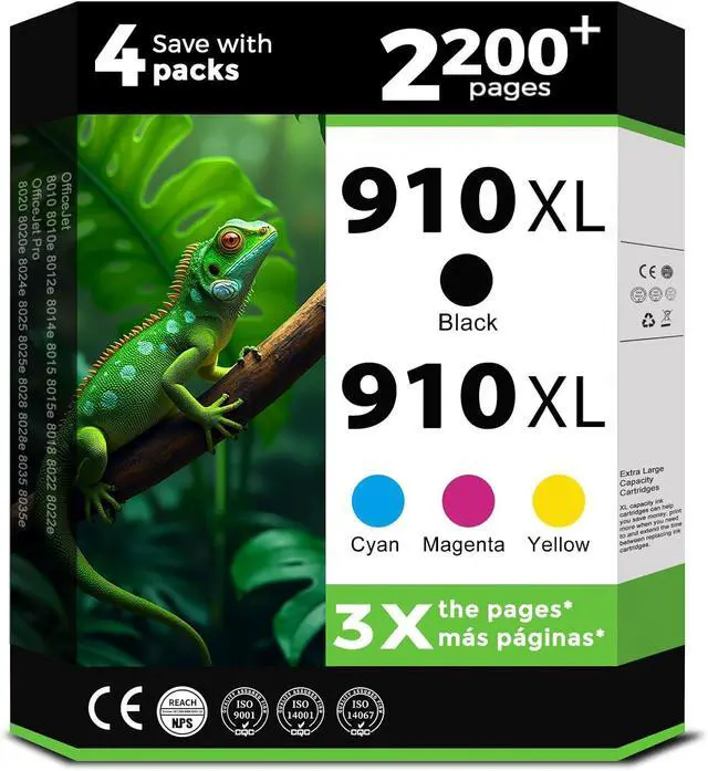 Package contents: 4-pack of 910 xl ink (1 910xl black, 1 910xl cyan, 1 910xl magenta, 1 910xl yellow), and a user guide