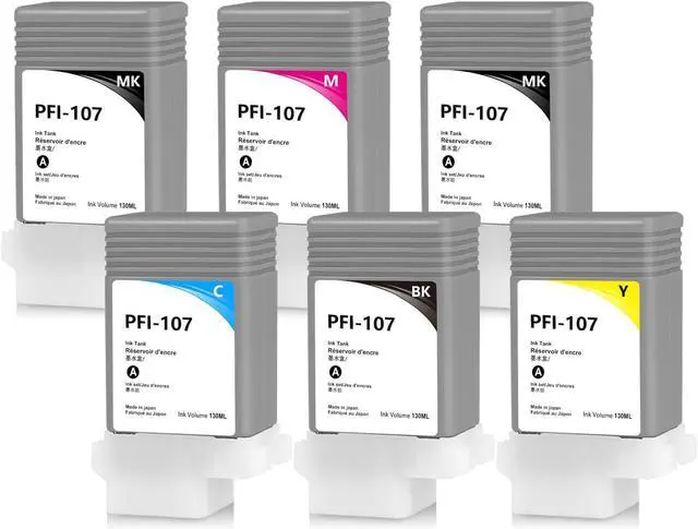 What You Get: 6Pack Upgrade Replacement for Canon PFI-107 ink cartridges (2 Matte Black 1 Cyan 1 Magenta 1 Yellow 1 Black ).